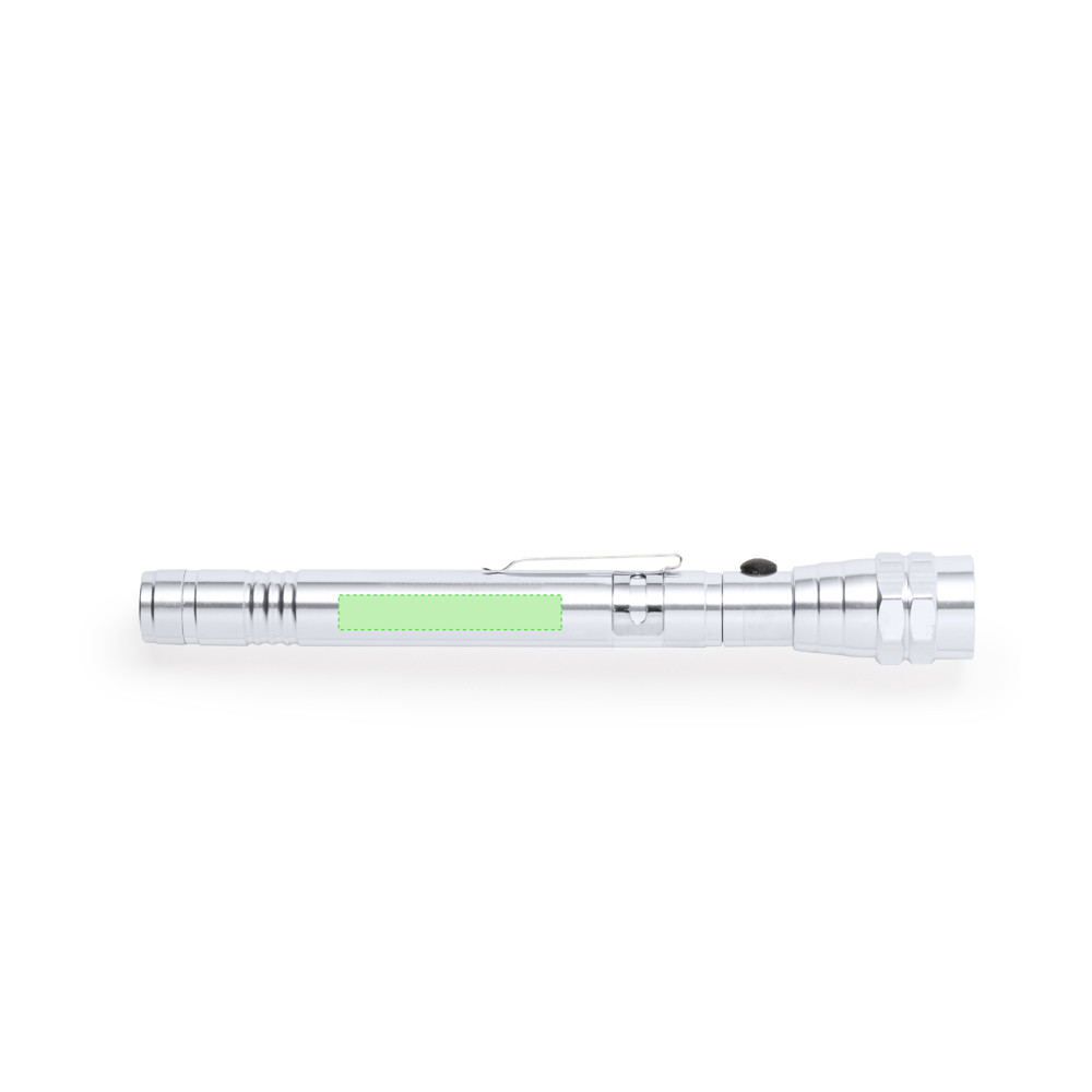 Praktische en veelzijdige aluminium zaklamp, met uitschuifbare kop (waardoor de lengte verdriedubbelt) en flexibel om overal bij te kunnen. Hij is uitgerust met magneten om zich aan te passen aan verschillende behoeften en heeft 3 krachtige LED's voor efficiënte verlichting. Werkt op knoopbatterijen - meegeleverd - en op een metalen clip. Individueel verpakt in een kraft design doos.